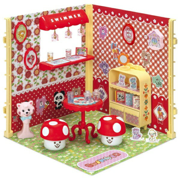 “SWIMMER(スイマー)”のキャラクターでいっぱいの壁に、棚やテーブル、スツールを配置すれば、かわいいSWIMMERに囲まれた夢のお部屋が完成。